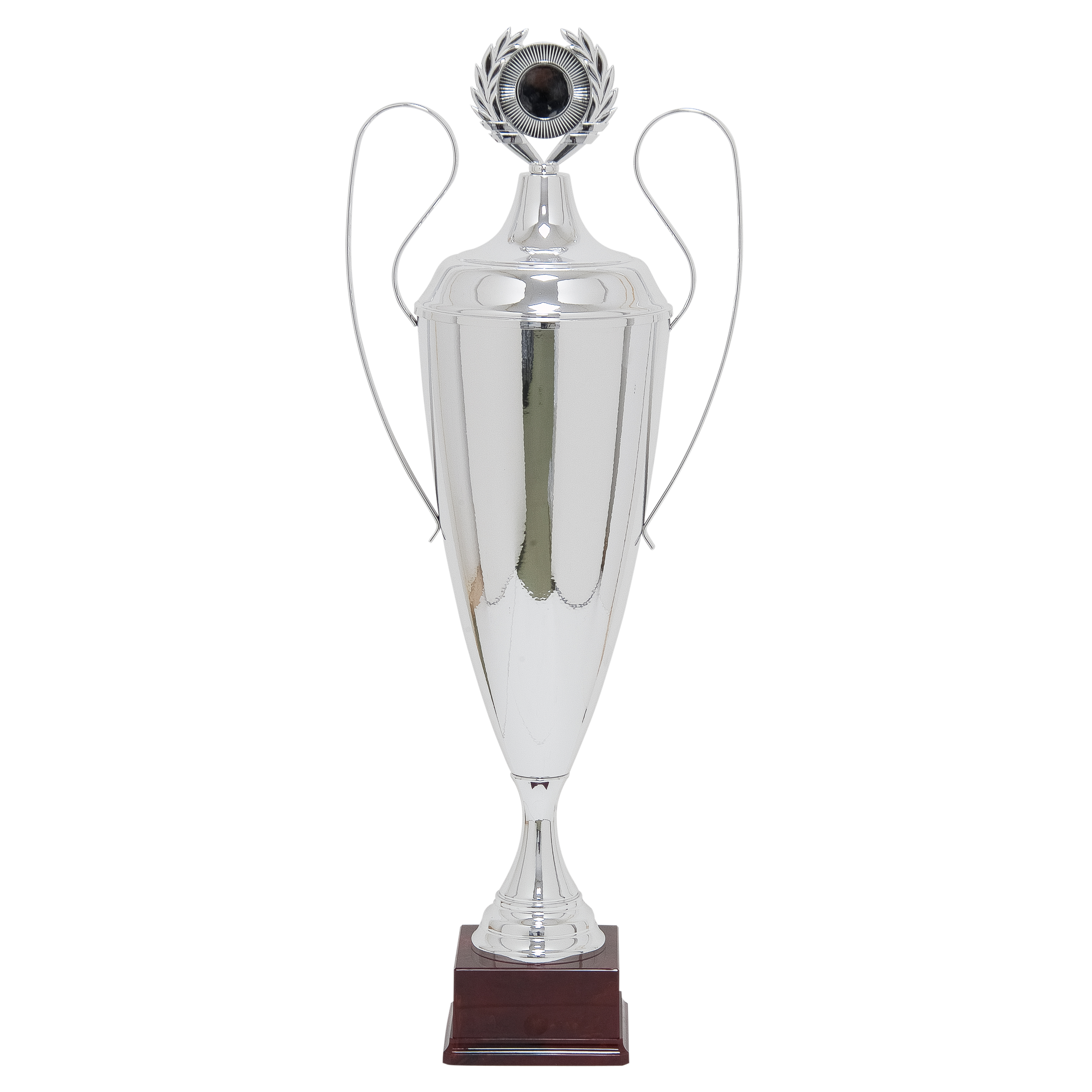 Grote luxe zilverkleurige metalen beker op een zwarte voet van 105 cm hoog.