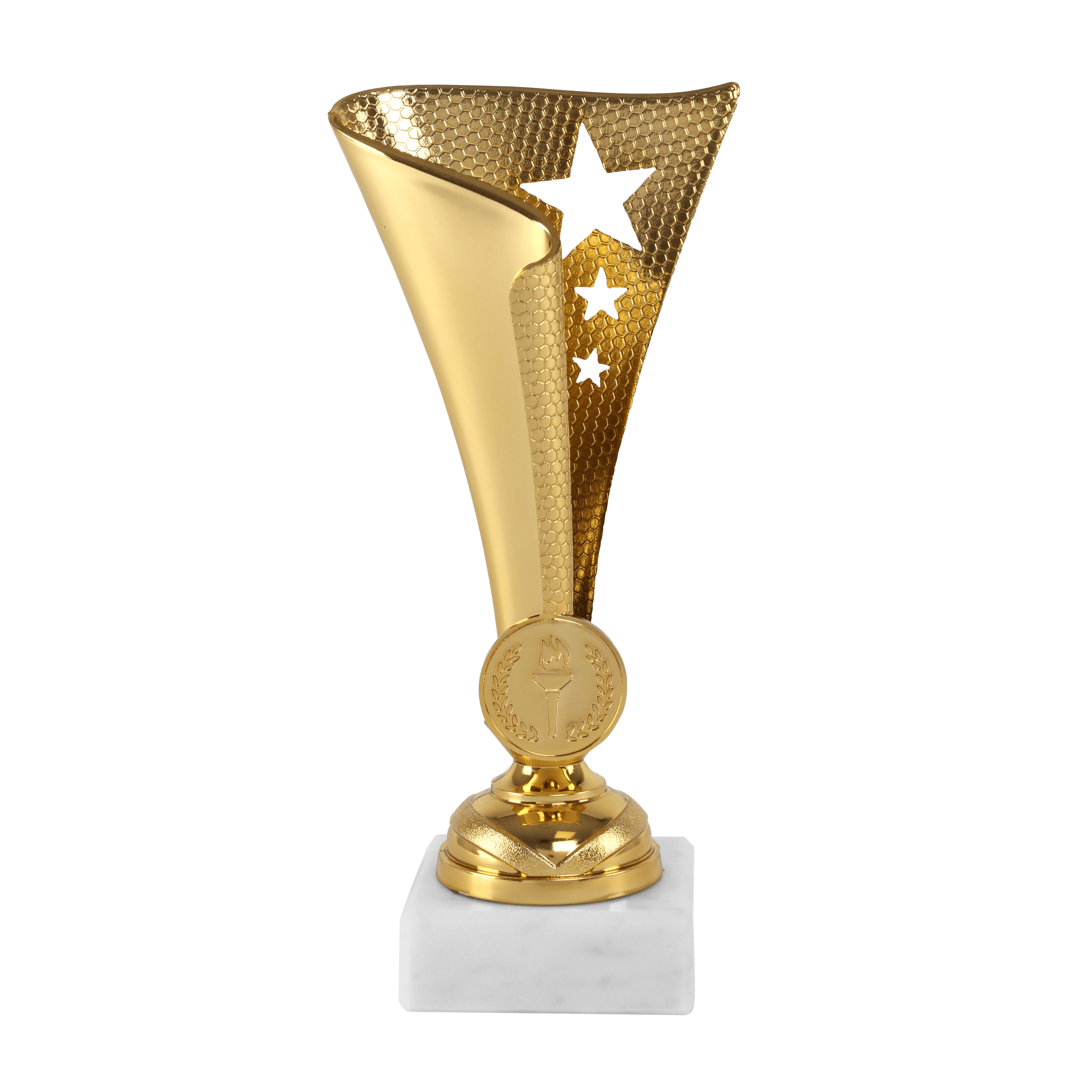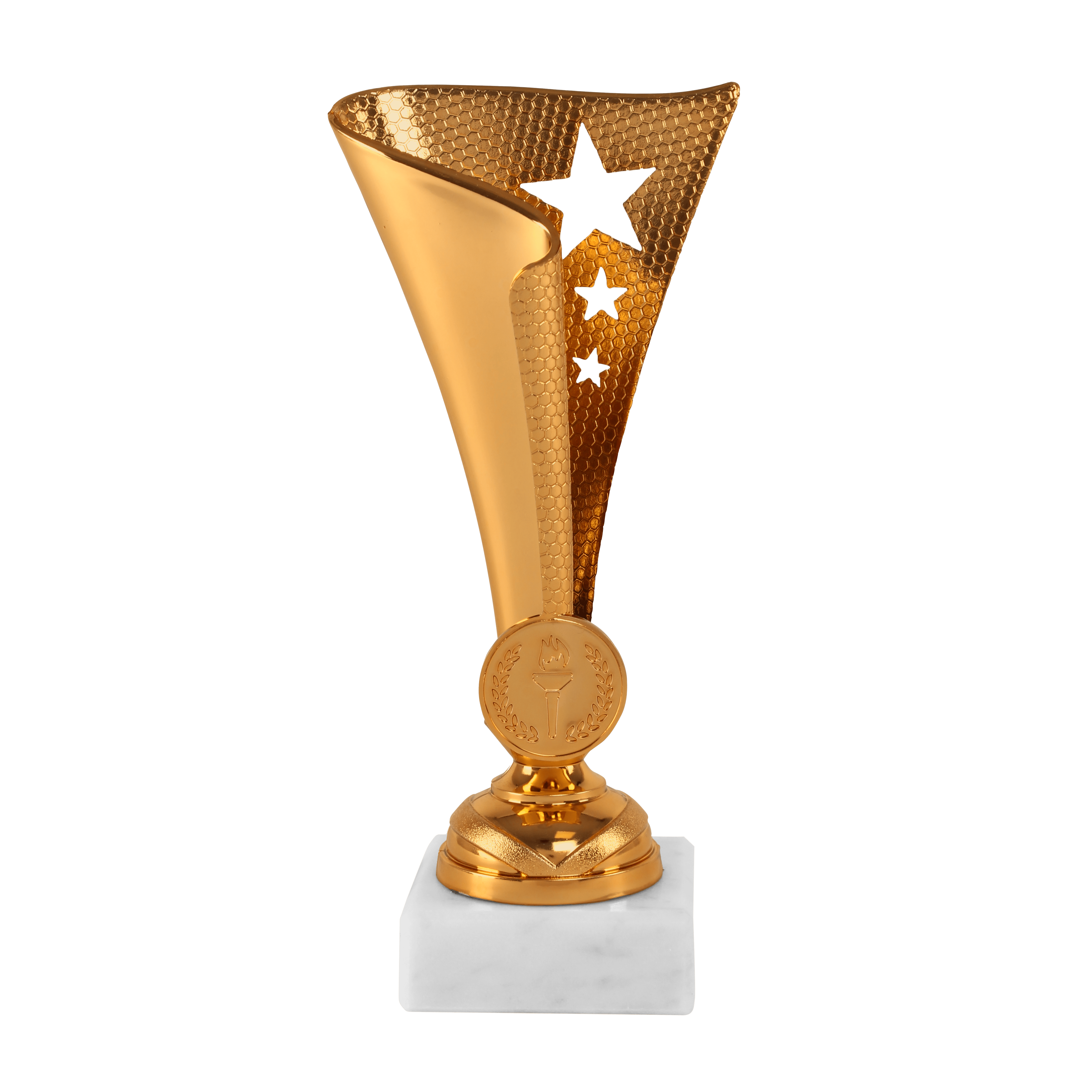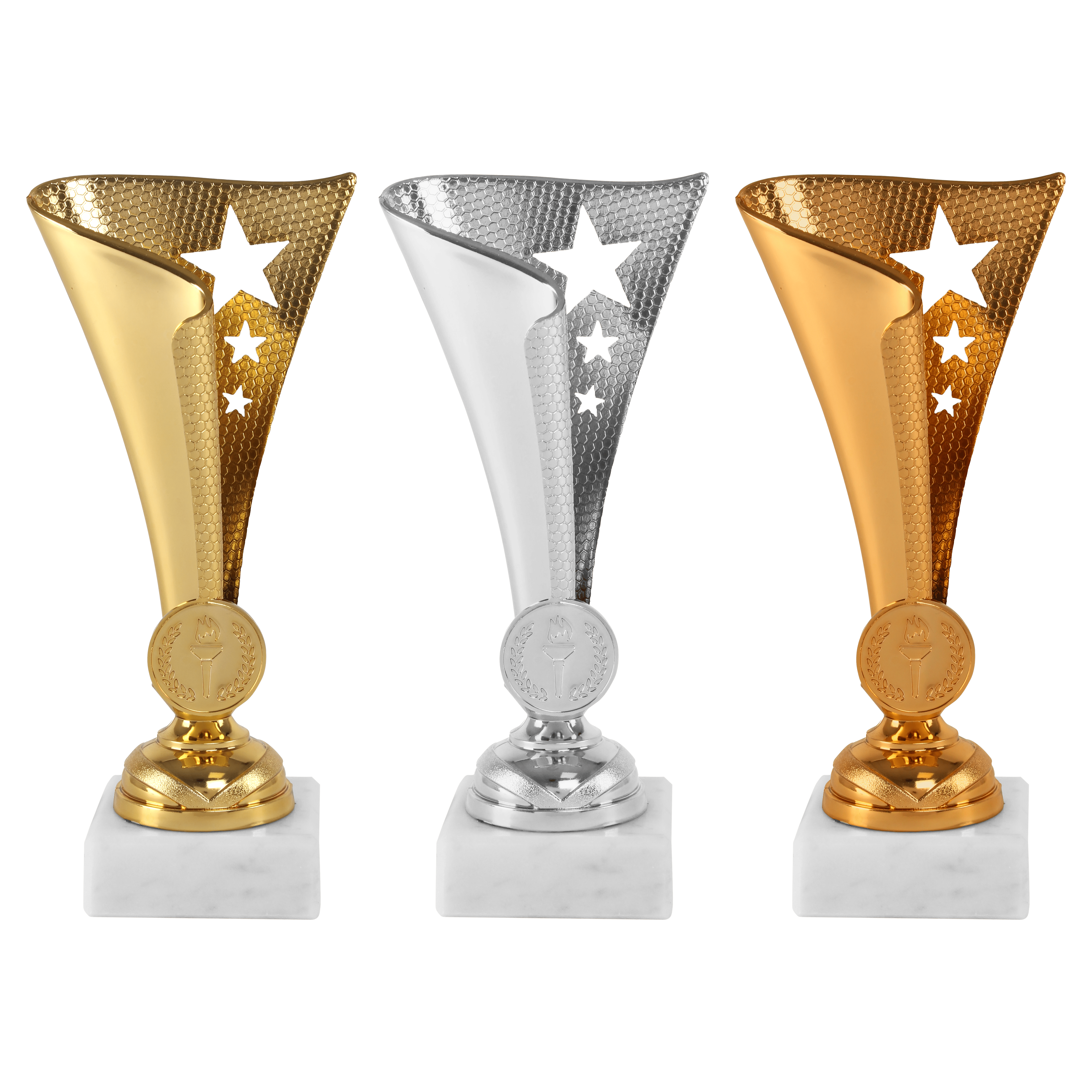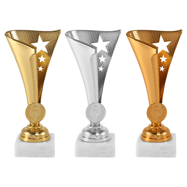 Beker verkrijgbaar in goud, zilver en brons, afmeting 17 cm