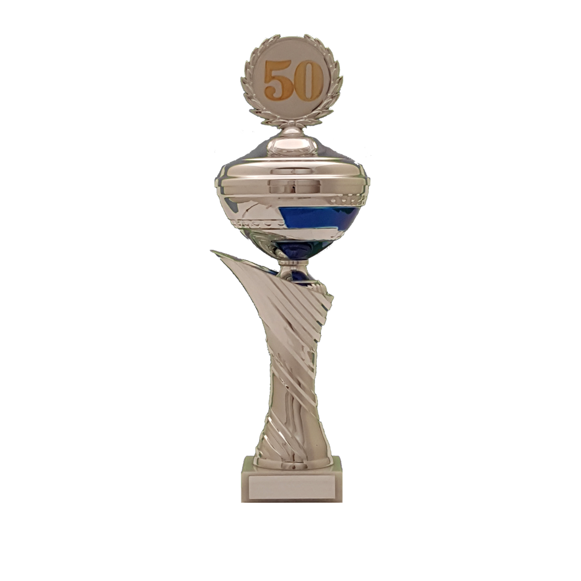 Zilver met blauw kleurige beker met een 50mm afbeelding in de top.
