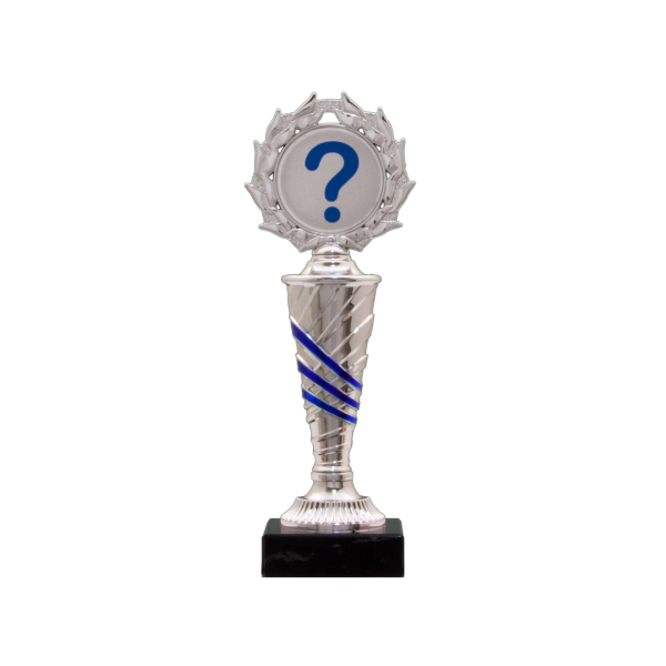 Zilver met blauwkleurige standaard op zwart marmer met 50mm afbeelding.